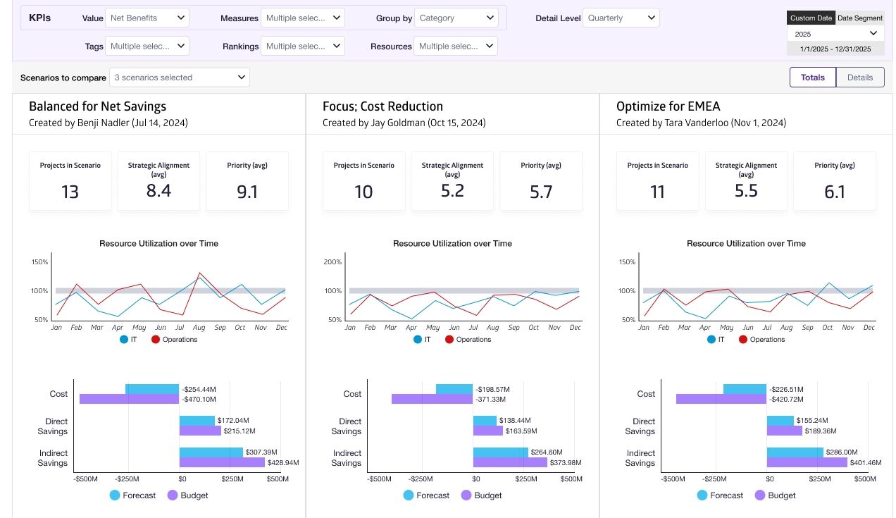 Master strategic portolio management with Conductor's scenario planner. Quickly build scenarios optimized for different KPIs, measure impact of project combinations, and share plans across your team.